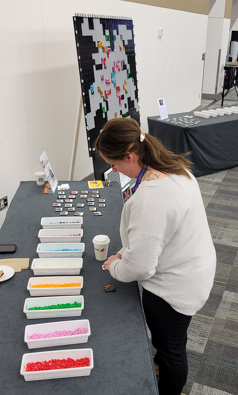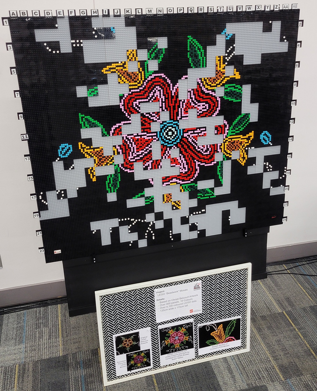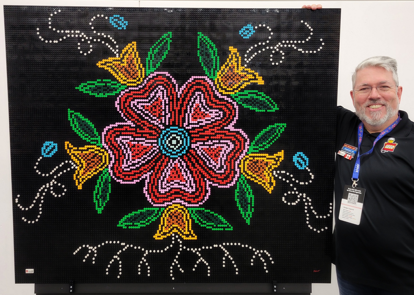 January 2025: Robin facilitated an interactive Metis beadwork mosaic build, at the ISET Gathering in Ottawa. The original artwork came from renowned artist Christ Belcourt. The finished LEGO piece will remain in her Ottawa gallery for a time, and will then be auctioned off for charity. Click the photo at right for more on the design process and the build itself. |